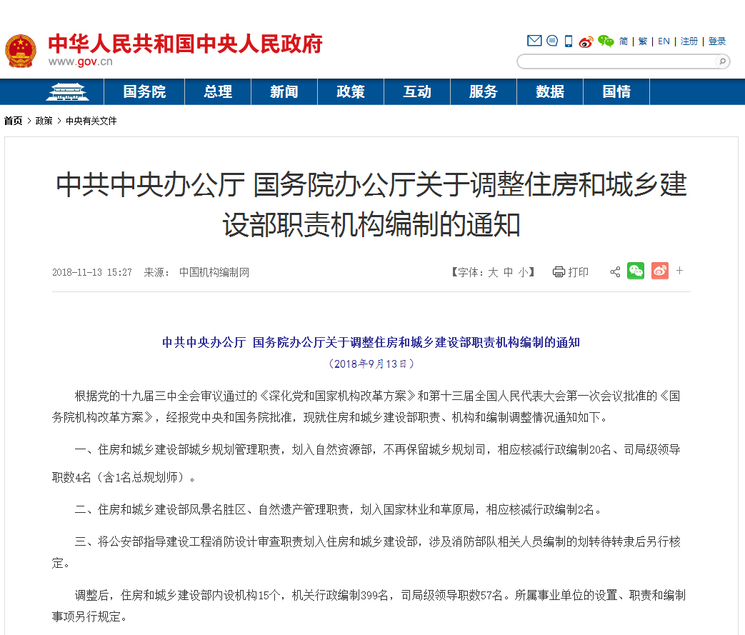 2018年11月13日中國政府網(wǎng)官網(wǎng)公布“中共中央辦公廳 國務(wù)院辦公廳關(guān)于調整住房和城鄉建設部職責機構編制的通知”,將公安部指導建設工程消防設計審查職責劃入住房和城鄉建設部,涉及消防部隊相關(guān)人員編制的劃轉待轉隸后另行核定。