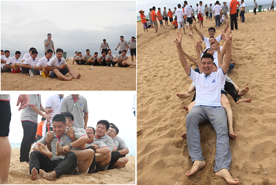 通過(guò)前面三個(gè)緊張的比賽之后,決出了四個(gè)隊伍進(jìn)行終極項目—沙灘足球比賽。比賽中我們全體成員手拉手圍出了一個(gè)足球場(chǎng),大家既是邊界,又是觀(guān)眾,參與感非常強。每一次斷球,都有搶奪競爭對手客戶(hù)時(shí)的喜悅;每一次傳球,都是團隊隊員相互之間的信任;每一次帶球奔馳,都像手握項目漏斗有底氣;最后的臨門(mén)一腳,像揮灑汗水拿到了訂單,充滿(mǎn)了愉悅??粗?zhù)大家在金沙上努力拼搏的樣子,我們激情高漲,抬頭看了看海的遠方,心中充滿(mǎn)了愛(ài)與喜悅。